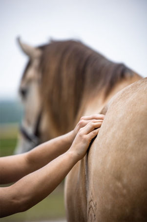 Le praticien utilise principalement ses mains pour exercer des pressions douces sur certains points de pression et méridiens du cheval.